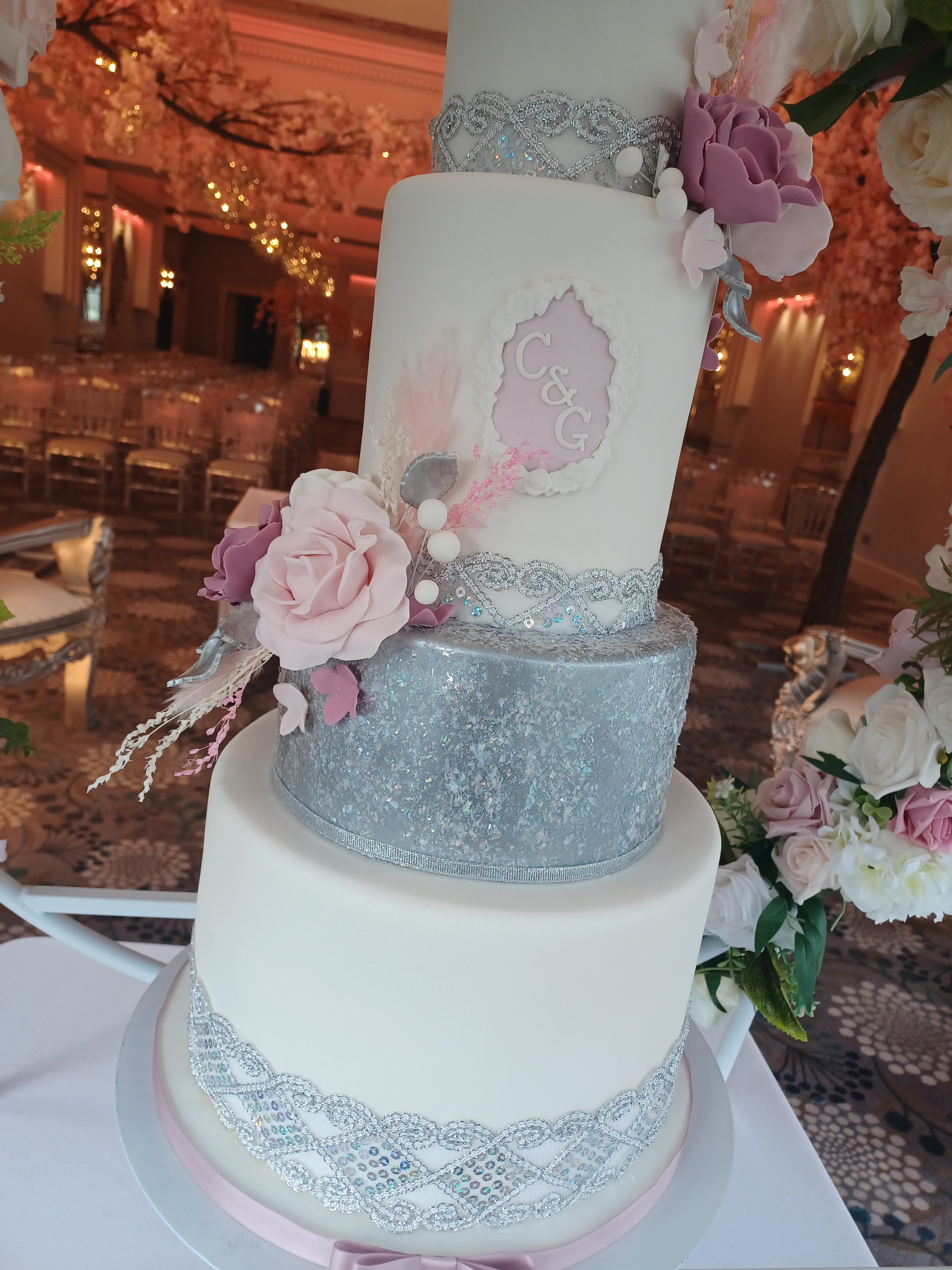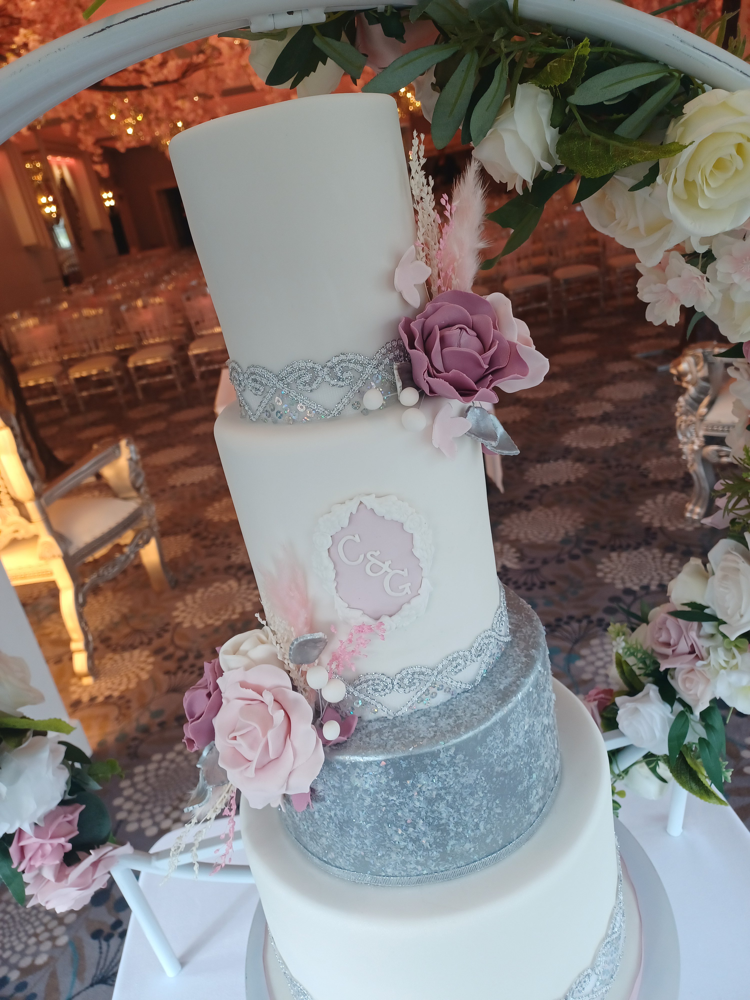 We started the month with Charlotte and Gareth. Their’s was a cake with the WOW factor! A beautiful 4 tier cake with silver glitter, diamantés, sugar and dried flowers. It look stunning in the gorgeous Cristal Suite at Thornton Hall Hotel.