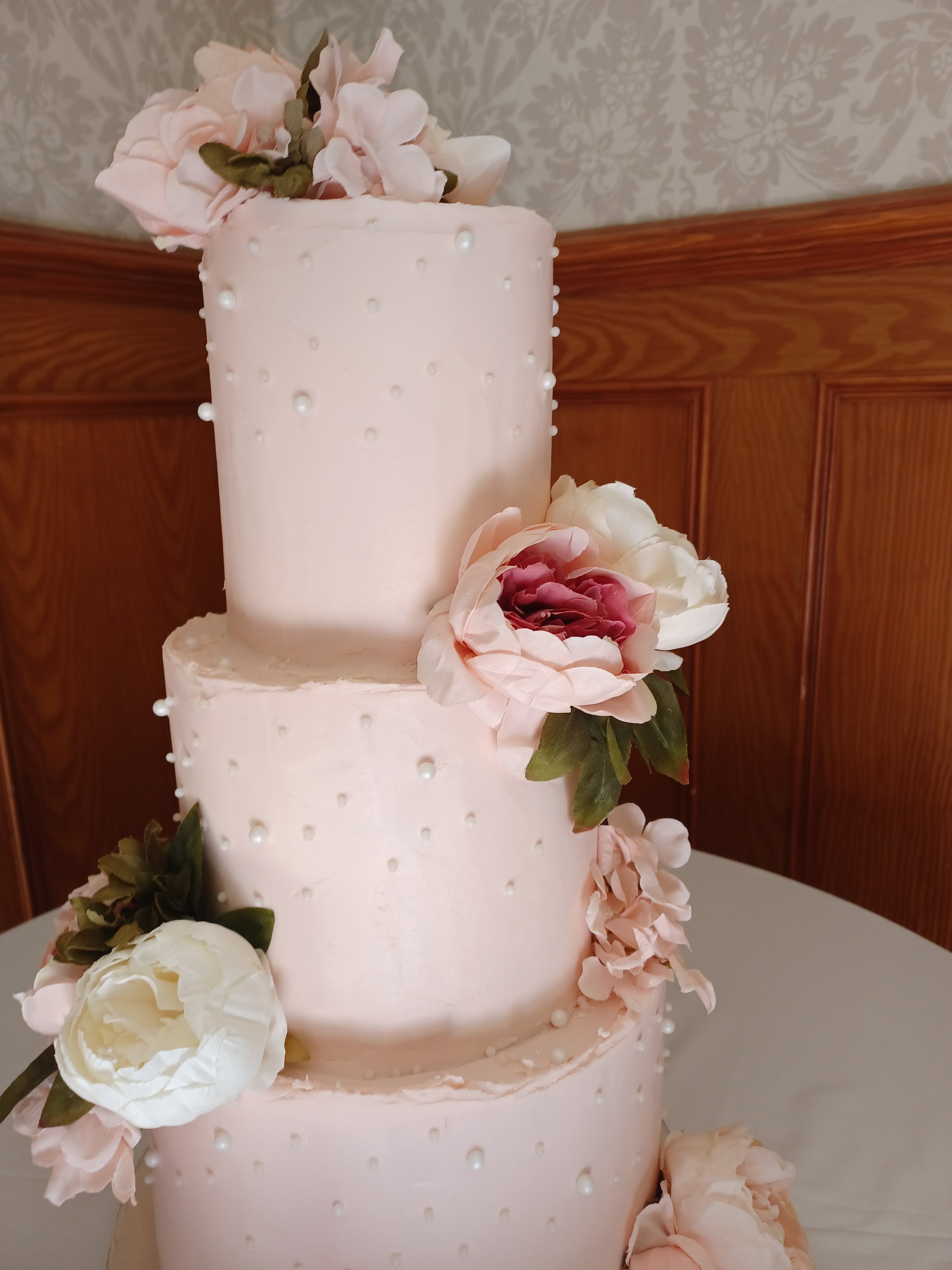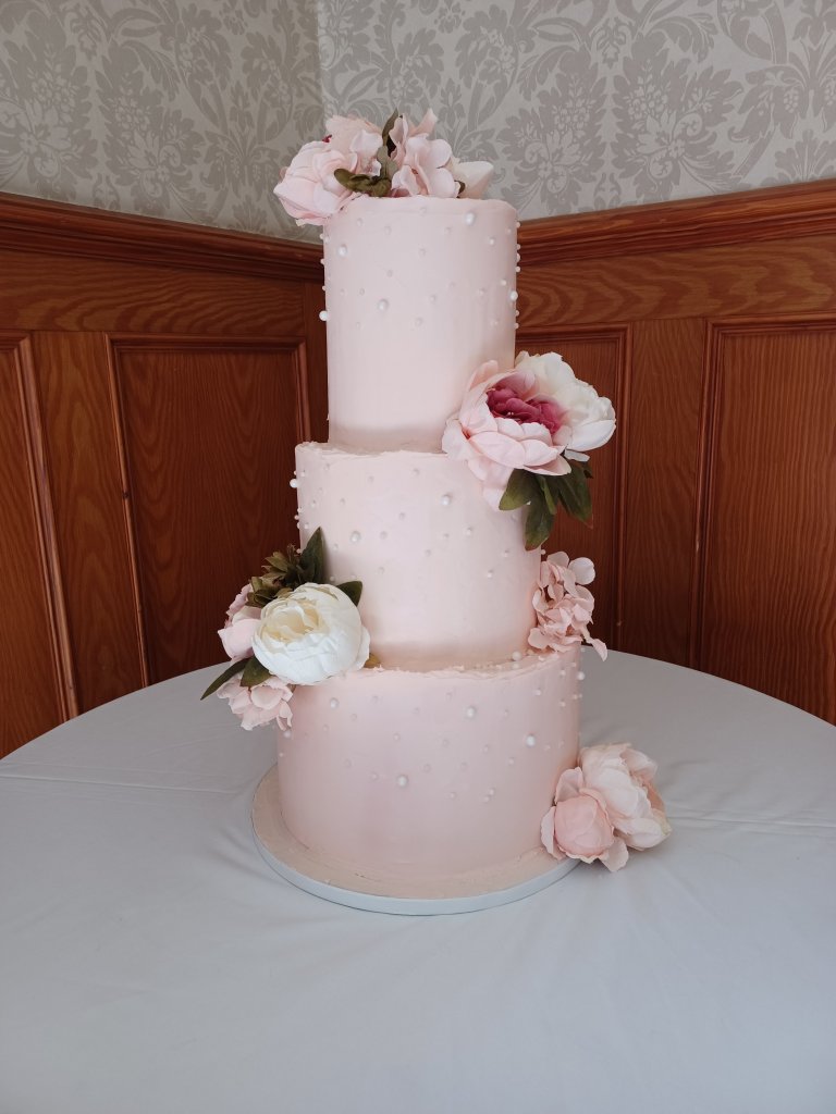Wedding no.3 was for the lovely El and Aaron. A beautifully understated 3 tier in the palest of pinks. A smooth buttercream finish, with sugar pearls and delicate silk flowers. They celebrated their nuptials at the stunning Nunsmere Hall.